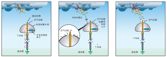 這兩個(gè)效果引發(fā)穩(wěn)定的先導(dǎo)傳播來(lái)保證可靠截獲雷電。優(yōu)化的空氣間隙尺寸使觸發(fā)電弧只有當(dāng)周?chē)妶?chǎng)高到能保證產(chǎn)生穩(wěn)定的上行先導(dǎo)來(lái)成功截獲雷電時(shí)才發(fā)生。