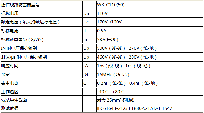 WX-C110(50)防雷器用于通訊線路、控制線路保護,對入井口通信線路的電流超過截止起動電流時自動熔斷;對雷擊浪涌電壓及某些人為的原因意外將電力線路錯搭接到通信線路等引起的危害及由大功率設備開關機而引入的浪涌高幅值脈沖干擾信號等泄入大地。用于保護數(shù)據(jù)測量和控制的設備,是非平衡電路保護器,其包含粗和精細兩級保護,安裝在LPZ0-2截面。
