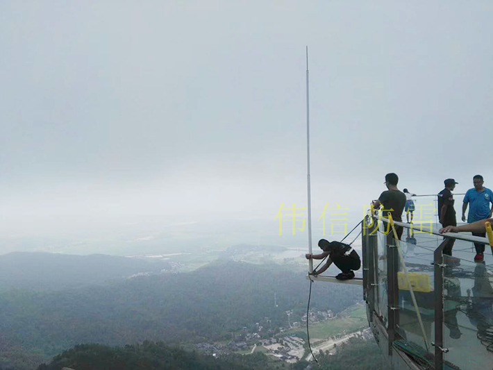 2018年8月應(yīng)要求,陜西偉信防雷應(yīng)要求為安徽安慶巨石山風(fēng)景區(qū)的玻璃棧道做直擊雷防護(hù),此次直擊雷防雷工程用到15根9米玻璃鋼避雷針、等電位雷電計數(shù)箱、石墨接地模塊、降阻劑、銅包鋼接地棒等水平接地體、垂直接地體等防雷材料。