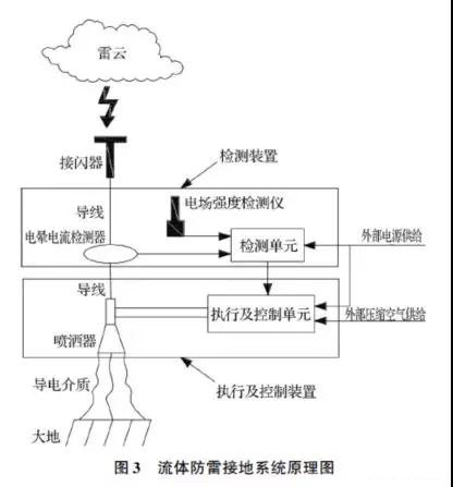 軍用移動(dòng)電站的有效防雷關(guān)鍵技術(shù)是為雷電建立一個(gè)泄放通道,即有效接地的問題,這也是該系統(tǒng)解決的最關(guān)鍵問題。其技術(shù)原理為:雷電來臨前,在接閃器附近感應(yīng)出較高的電場電壓或在傳感器上感應(yīng)出高點(diǎn)電暈電流,檢測器將其信號(hào)傳至信號(hào)放大控制單元檢測雷擊電荷累積的危險(xiǎn)狀態(tài)信號(hào),當(dāng)其大于安全閾值時(shí)產(chǎn)生并輸出有效的控制信號(hào)再處理控制放大單元選擇、判斷計(jì)算,并放大信號(hào)后傳至執(zhí)行單元;執(zhí)行單元放大執(zhí)行信號(hào),驅(qū)動(dòng)執(zhí)行器,使儲(chǔ)存在容器中經(jīng)特殊配置的流體導(dǎo)電介質(zhì),按照規(guī)定的路徑、噴注直徑、噴灑到大地的空間,以使所述導(dǎo)電介質(zhì)在車體接地部位與大地之間形成電荷泄放通道,如圖3 所示。